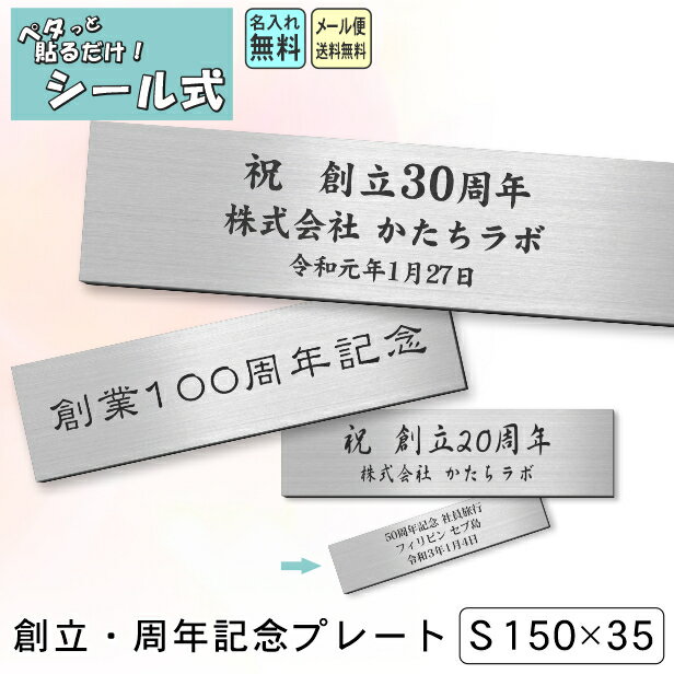 創立記念プレート 記念品プレート ネームプレート【名入れ刻印無料】ステンレス調 シルバー S 150×35mm お祝い メッセージ 記念日 名入れ 設立 会社 ロゴマーク 贈答品 周年 軽くて丈夫 錆びないアクリル製 貼るだけシール式 銀色 メール便送料無料 商品番号[10001917]