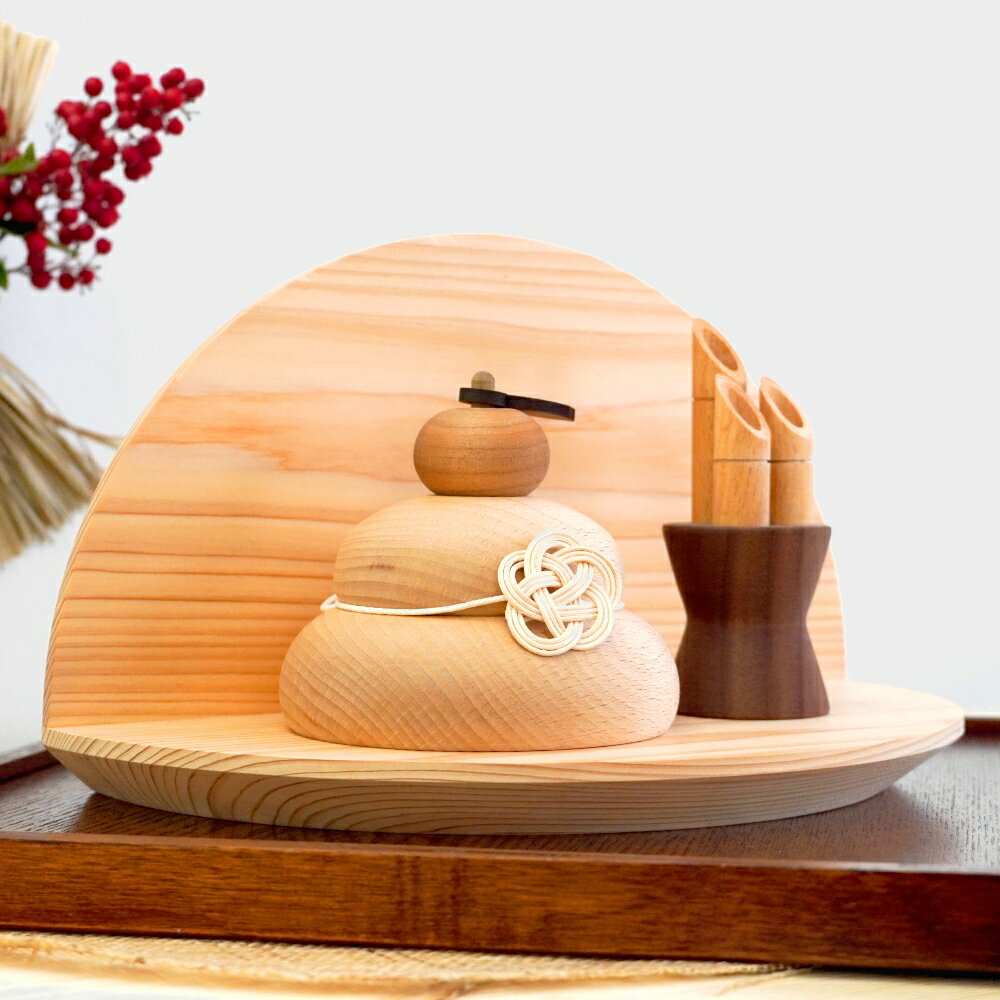 【23年12月上旬お届け予定分 受付中】 鏡餅 木製 お正月 門松 インテリア 縁起物 新築祝 床の間飾り 卓上 置物 小物 飾り付け コンパクト おしゃれ かわいい かがみもち 鏡もち 二段 サイズ 手作り 国産 【クムキ 色 ~いろ~ 正月飾り 鏡餅 半月台座付き】